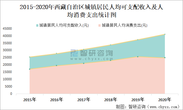 2015-2020年西藏自治區(qū)城鎮(zhèn)居民人均可支配收入及人均消費支出統(tǒng)計圖