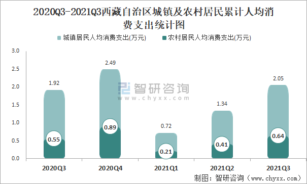 2020Q3-2021Q3西藏自治區(qū)城鎮(zhèn)及農(nóng)村居民累計人均消費支出統(tǒng)計圖