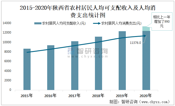 2015-2020年陜西省農村居民人均可支配收入及人均消費支出統計圖