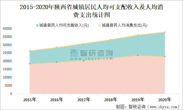 2015-2020年陜西省城鎮居民人均可支配收入及人均消費支出統計圖