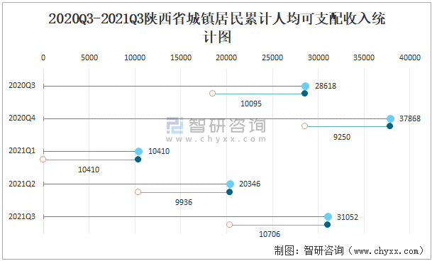 2020Q3-2021Q3陜西省城鎮居民累計人均可支配收入統計圖