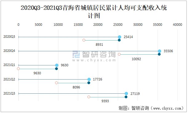 2020Q3-2021Q3青海省城鎮居民累計人均可支配收入統計圖
