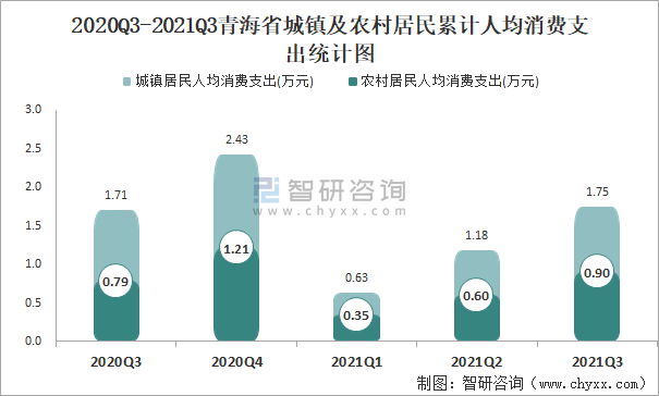 2020Q3-2021Q3青海省城鎮及農村居民累計人均消費支出統計圖