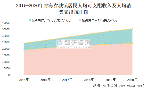 2015-2020年青海省城鎮居民人均可支配收入及人均消費支出統計圖