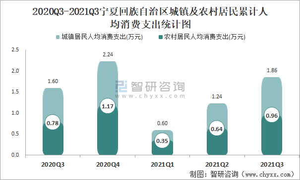 根據國家統計局數據顯示:2021年第三季度寧夏回族自治區城鎮居民人均消費支出為1.86萬元,同比增長15.89%,農村居民人均消費支出為0.96萬元,同比增長22.99%,城鎮居民人均消費支出是農村居民人均消費支出的1.94倍;2021年第三季度寧夏回族自治區城鎮居民人均消費支出占2020Q3-2021Q3寧夏回族自治區城鎮居民人均消費支出的24.64%,農村居民人均消費支出占比達到24.56%。