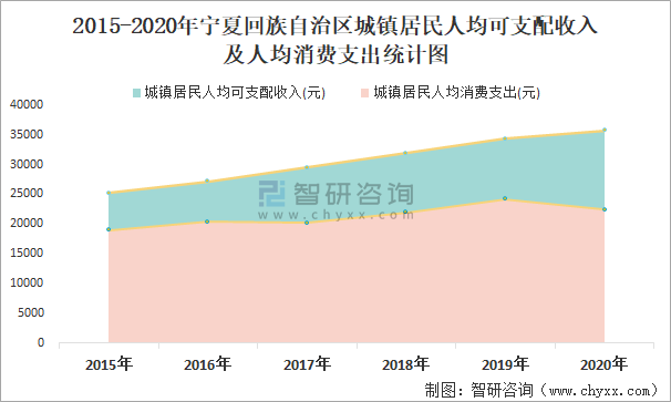 2015-2020年寧夏回族自治區城鎮居民人均可支配收入及人均消費支出統計圖