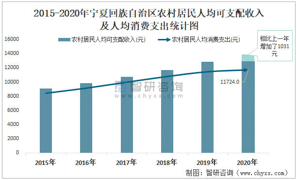 2015-2020年寧夏回族自治區農村居民人均可支配收入及人均消費支出統計圖