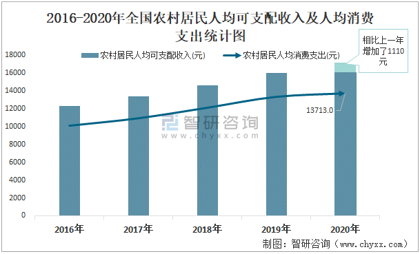 2016-2020年全國農村居民人均可支配收入及人均消費支出統計圖