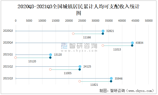 2020Q3-2021Q3全國城鎮居民累計人均可支配收入統計圖