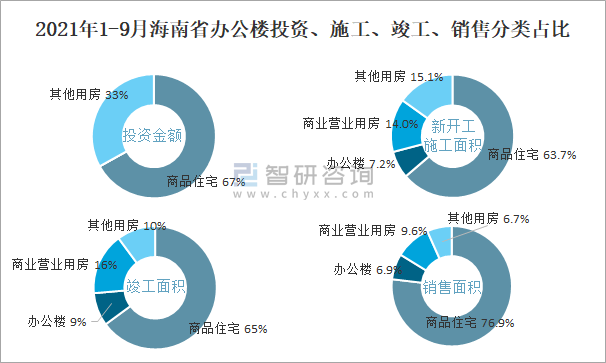 根據國家統計局數據統計可知:2021年1-9月海南省房地產開發企業在包括辦公樓在內的其他用房投資金額占比為33.1%(注:只有投資金額中其他用房包含辦公樓、商業營業用房),辦公樓的新開工面積與竣工面積所占比重差異不大,從銷售面積來看,辦公樓銷售面積占比少于商業營業用房銷售面積占比。