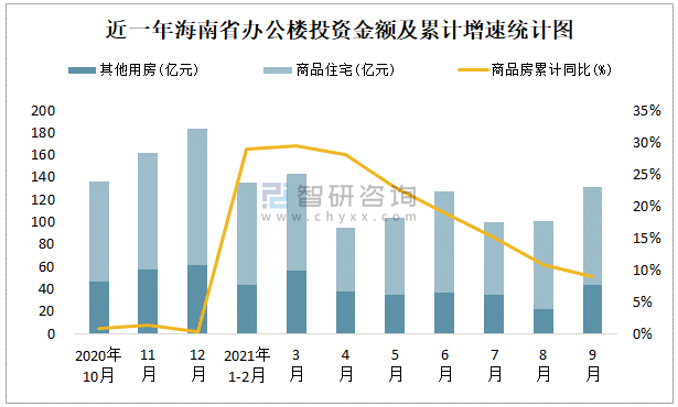 根據國家統計局數據統計可知:2021年9月海南省房地產開發投資商品房投資金額為131.81億元,其中包括辦公樓、商業營業用房等其他用房43.9億元(注:辦公樓、商業營業用房未分開統計);2021年1-9月海南省房地產開發投資包括辦公樓在內的其他用房累計金額為309.7億元。