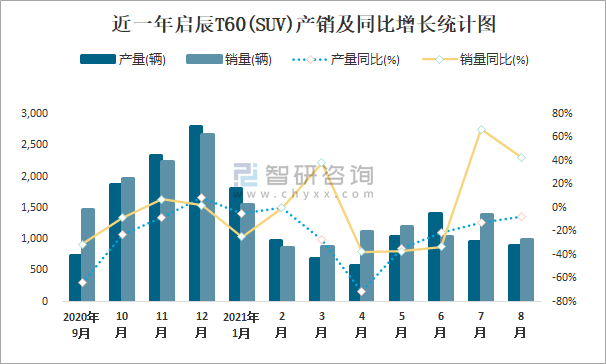 近一年啟辰T60(SUV)產(chǎn)銷及同比增長統(tǒng)計圖