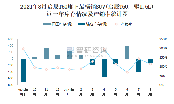 2021年8月啟辰T60旗下最暢銷SUV(啟辰T60二驅(qū)1.6L)近一年庫存情況及產(chǎn)銷率統(tǒng)計圖