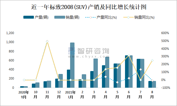 近一年標(biāo)致2008(SUV)產(chǎn)銷及同比增長統(tǒng)計(jì)圖