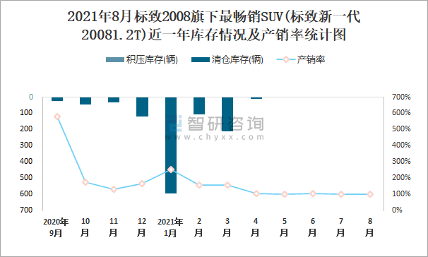 2021年8月標(biāo)致2008旗下最暢銷SUV(標(biāo)致新一代20081.2T)近一年庫存情況及產(chǎn)銷率統(tǒng)計(jì)圖