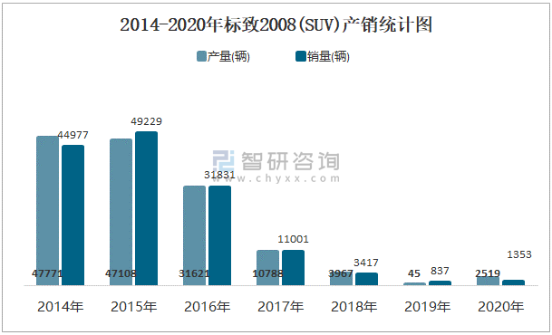 2014-2020年標(biāo)致2008(SUV)產(chǎn)銷統(tǒng)計(jì)圖