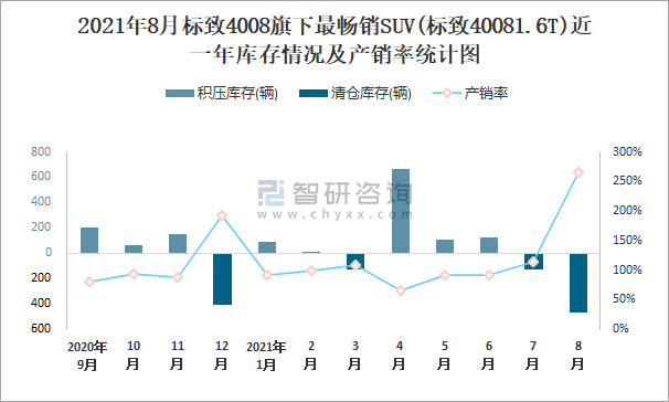 2021年8月標(biāo)致4008旗下最暢銷SUV(標(biāo)致40081.6T)近一年庫存情況及產(chǎn)銷率統(tǒng)計圖