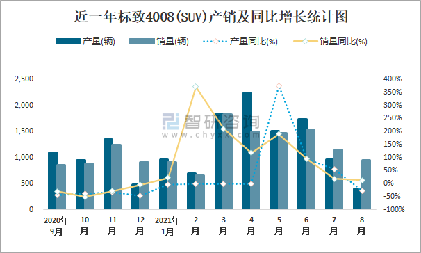 近一年標(biāo)致4008(SUV)產(chǎn)銷及同比增長統(tǒng)計圖