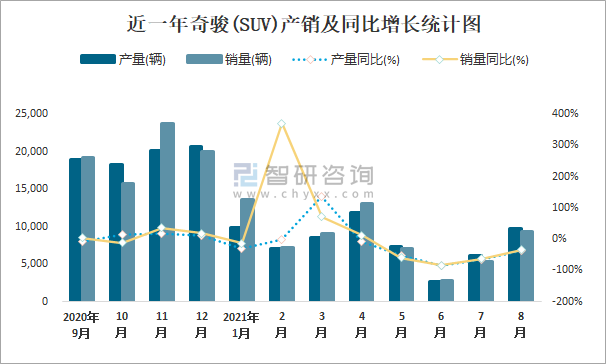 近一年奇駿(SUV)產(chǎn)銷及同比增長統(tǒng)計圖