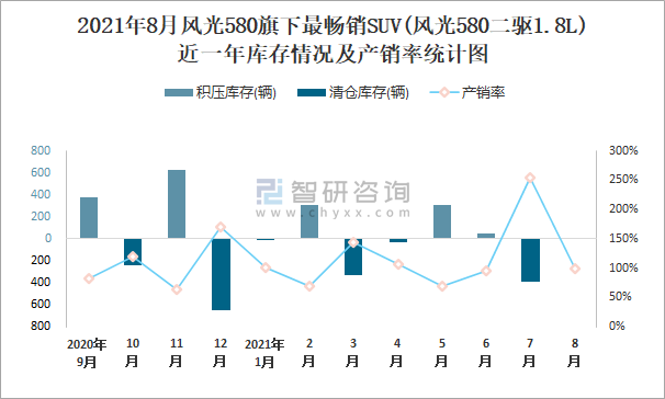 2021年8月風光580旗下最暢銷SUV(風光580二驅1.8L)近一年庫存情況及產銷率統計圖