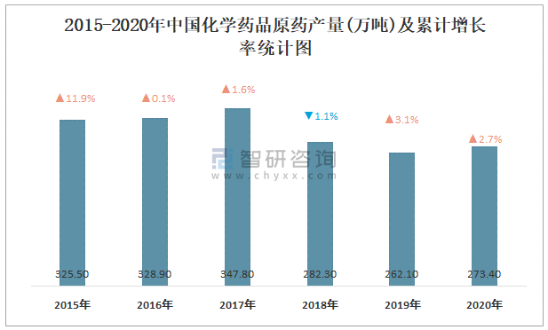 2015-2020年中國化學藥品原藥產量及累計增長率統計圖