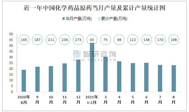 2021年1-8月中國化學藥品原藥產量為198.1萬噸 累計增長10.4%