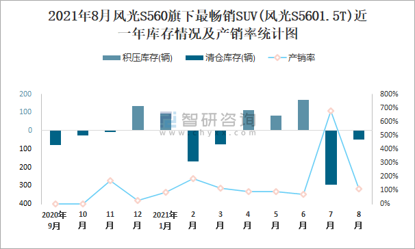 2021年8月風光S560旗下最暢銷SUV(風光S5601.5T)近一年庫存情況及產銷率統計圖