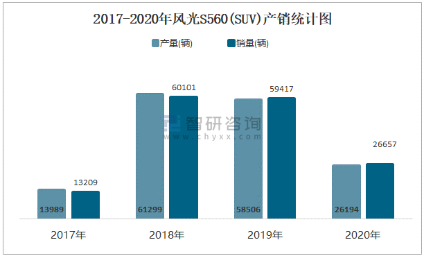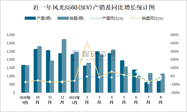 根據中國汽車工業協會數據可知:2021年8月風光S560(SUV)產量為690輛,同比下降0%,銷量為1143輛,同比下降27.1%,當月產銷率為165.65%;2021年1-8月風光S560(SUV)累計產量為13413輛,同比下降21%,累計銷量為14044輛,同比下降17.7%,累計產銷率為104.7%;2017-2020年風光S560(SUV)產銷量均在2018年達到最高值,此后逐年遞減,且近4年總產量大于總銷量,積壓了庫存604輛。