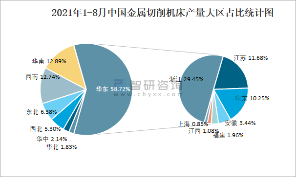 2021年1-8月中國金屬切削機床產量大區占比統計圖