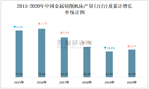 2015-2020年中國金屬切削機床產量及累計增長率統計圖