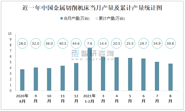 近一年中國金屬切削機床當月產量及累計產量統計圖