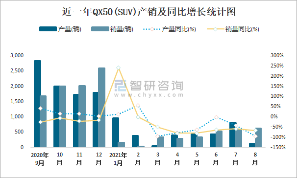 根據中國汽車工業協會數據可知:2021年8月QX50(SUV)產量為136輛,同比下降94.1%,銷量為622輛,同比下降66.8%,當月產銷率為457.35%;2021年1-8月QX50(SUV)累計產量為3600輛,同比下降59.8%,累計銷量為2891輛,同比下降65.7%,累計產銷率為80.31%;2018-2020年QX50(SUV)產銷量均在2019年達到最高值,此后有所下滑,且近3年總產量大于總銷量,積壓了庫存650輛。