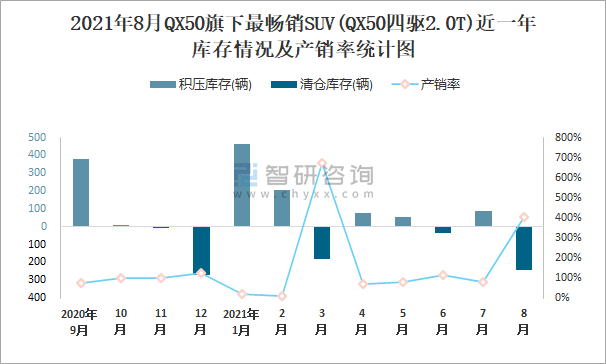 2021年8月QX50旗下最暢銷SUV(QX50四驅2.0T)近一年庫存情況及產銷率統計圖