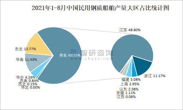 2021年1-8月中國民用鋼質船舶產量大區占比統計圖