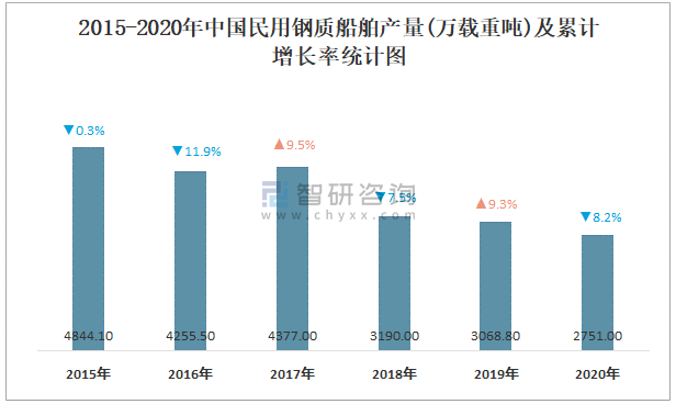 2015-2020年中國民用鋼質船舶產量及累計增長率統計圖