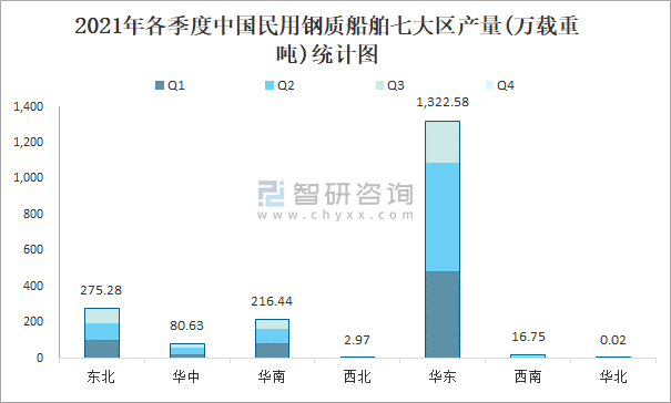 2021年各季度中國民用鋼質船舶七大區產量統計圖