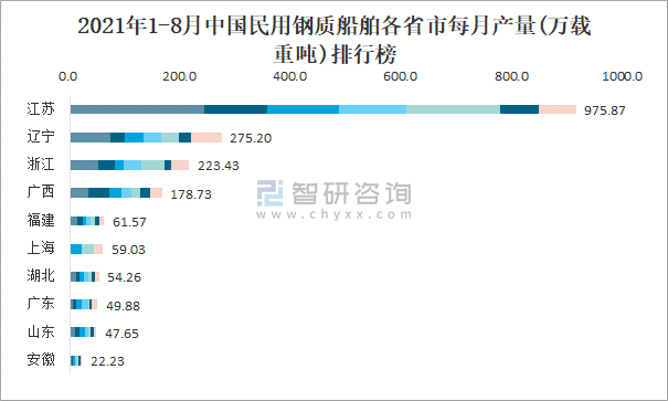 2021年1-8月中國民用鋼質船舶各省市每月產量排行榜