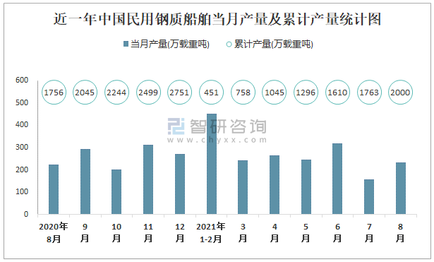 根據國家統計局數據顯示:2021年8月中國民用鋼質船舶產量為234萬載重噸,同比增長3.1%;2021年1-8月中國民用鋼質船舶累計產量為1999.9萬載重噸,累計增長12.5%;2015-2020年中國民用鋼質船舶產量2015年達到最高,此后總體呈現下降趨勢。
