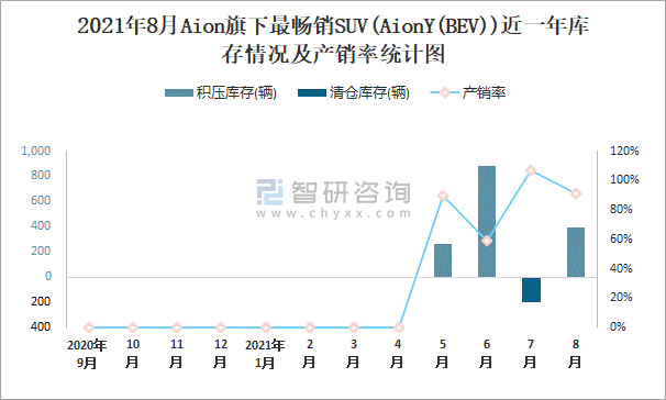 2021年8月AION旗下最暢銷SUV(AionY(BEV))近一年庫存情況及產銷率統計圖