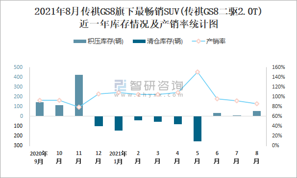 2021年8月傳祺GS8旗下最暢銷SUV(傳祺GS8二驅2.0T)近一年庫存情況及產銷率統計圖