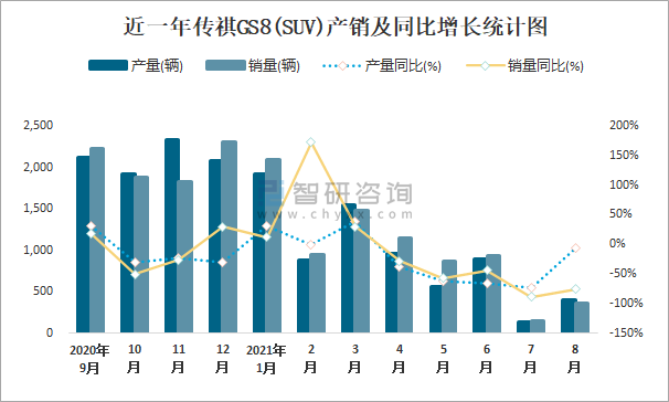 根據中國汽車工業協會數據可知:2021年8月傳祺GS8(SUV)產量為403輛,同比下降5.2%,銷量為356輛,同比下降75.4%,當月產銷率為88.34%;2021年1-8月傳祺GS8(SUV)累計產量為7289輛,同比下降20.8%,累計銷量為7983輛,同比下降30.3%,累計產銷率為109.52%;2016-2020年傳祺GS8(SUV)產銷量均在2017年達到最高值,此后逐年遞減,且近5年總產量大于總銷量,積壓了庫存1330輛。