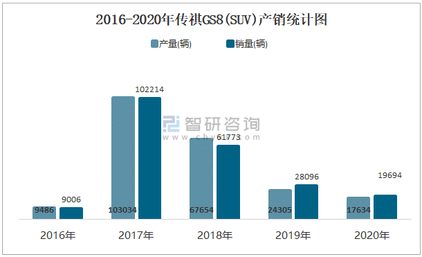2016-2020年傳祺GS8(SUV)產銷統計圖