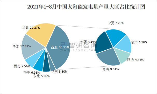 2021年1-8月中國太陽能發電量產量大區占比統計圖