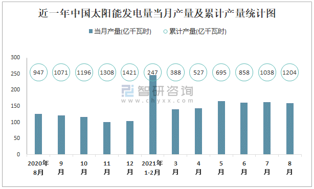 根據國家統計局數據顯示:2021年8月中國太陽能發電量產量為159億千瓦時,同比增長8.5%;2021年1-8月中國太陽能發電量累計產量為1204.3億千瓦時,累計增長10.3%;2016-2020年中國太陽能發電量產量2020年達到最高,總體呈現上升趨勢(此后逐年遞減。