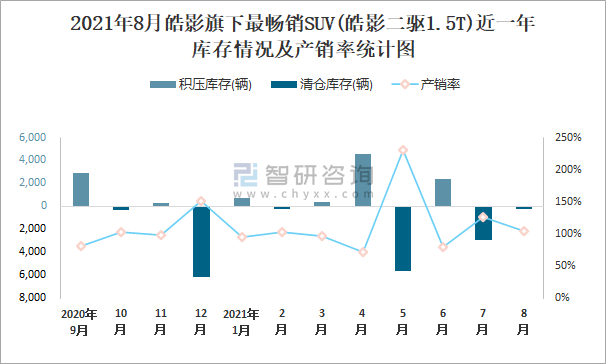 2021年8月皓影旗下最暢銷SUV(皓影二驅1.5T)近一年庫存情況及產銷率統計圖