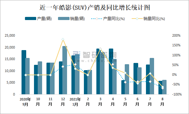 根據中國汽車工業協會數據可知:2021年8月皓影(SUV)產量為5640輛,同比下降68%,銷量為5977輛,同比下降60.8%,當月產銷率為105.98%;2021年1-8月皓影(SUV)累計產量為102392輛,同比增長4.5%,累計銷量為105124輛,同比增長12.8%,累計產銷率為102.67%;2019-2020年皓影(SUV)產銷量大幅度增加,且近2年總產量大于總銷量,積壓了庫存2802輛。