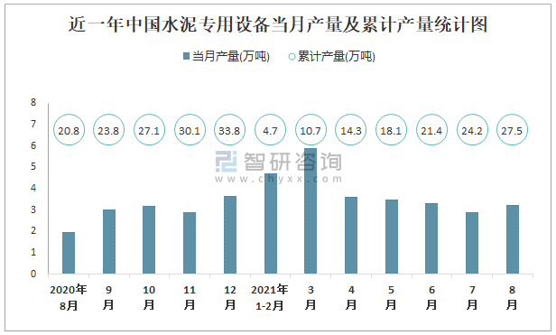 近一年中國水泥專用設(shè)備當月產(chǎn)量及累計產(chǎn)量統(tǒng)計圖