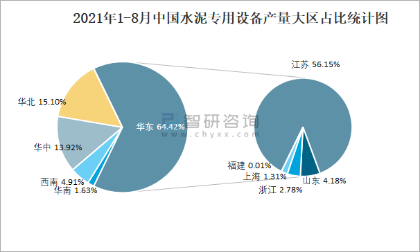 2021年1-8月中國水泥專用設(shè)備產(chǎn)量大區(qū)占比統(tǒng)計圖