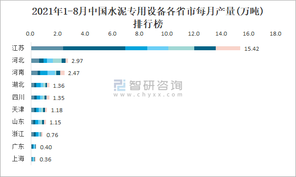 2021年1-8月中國水泥專用設(shè)備各省市每月產(chǎn)量排行榜