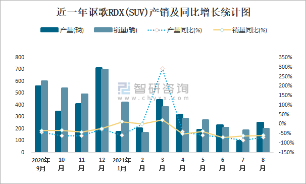 近一年謳歌RDX(SUV)產銷及同比增長統計圖